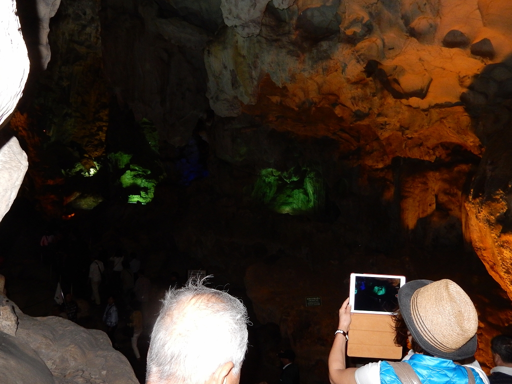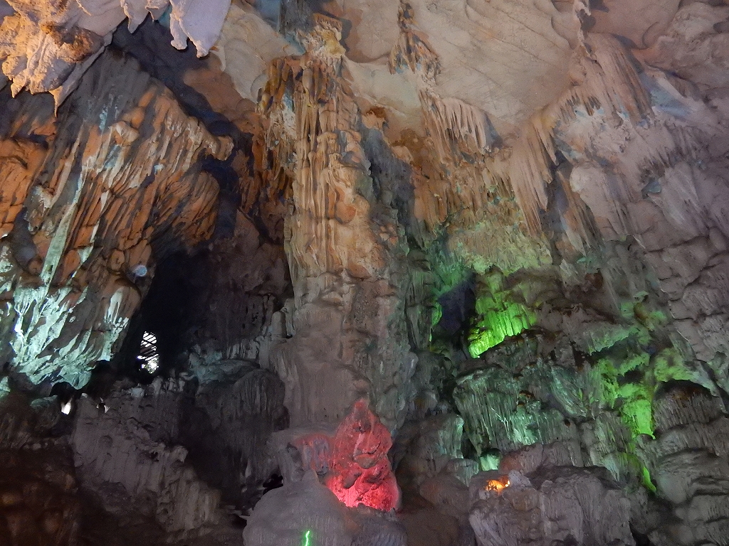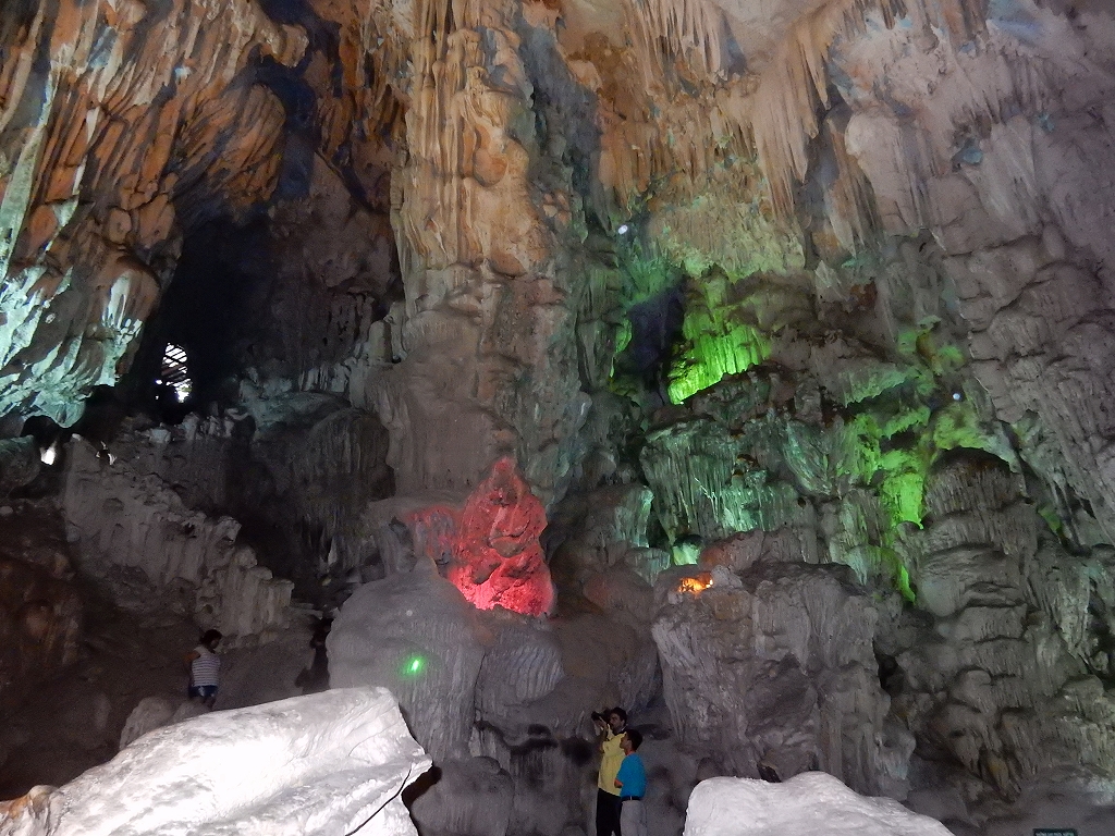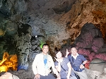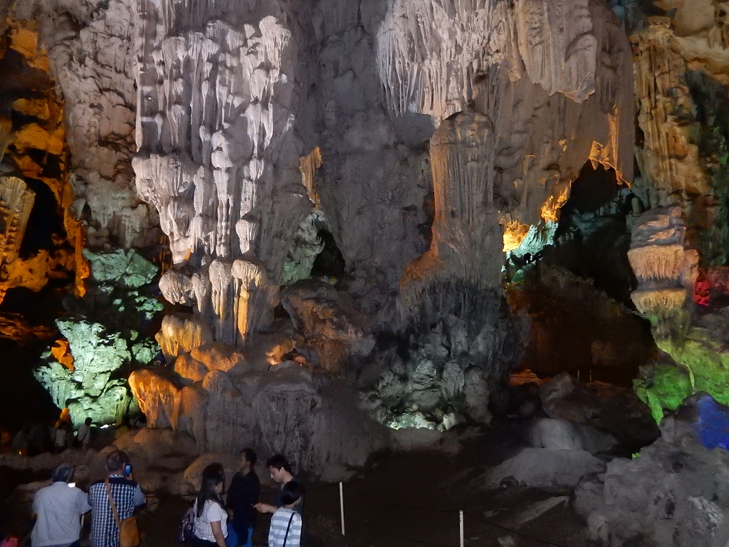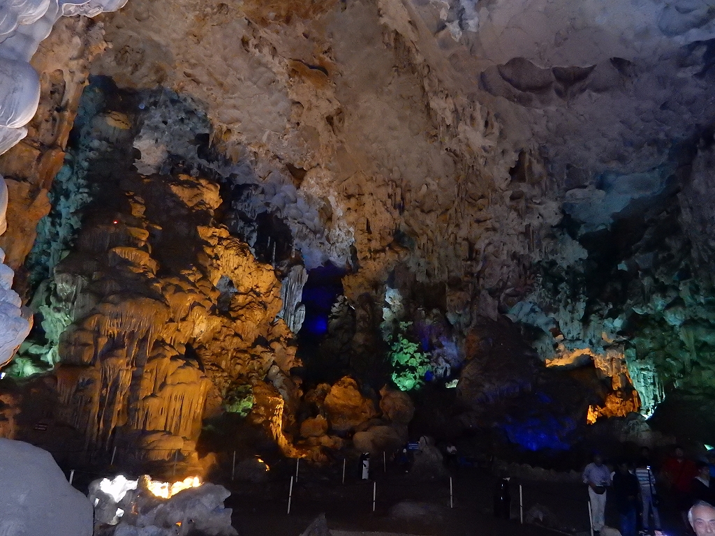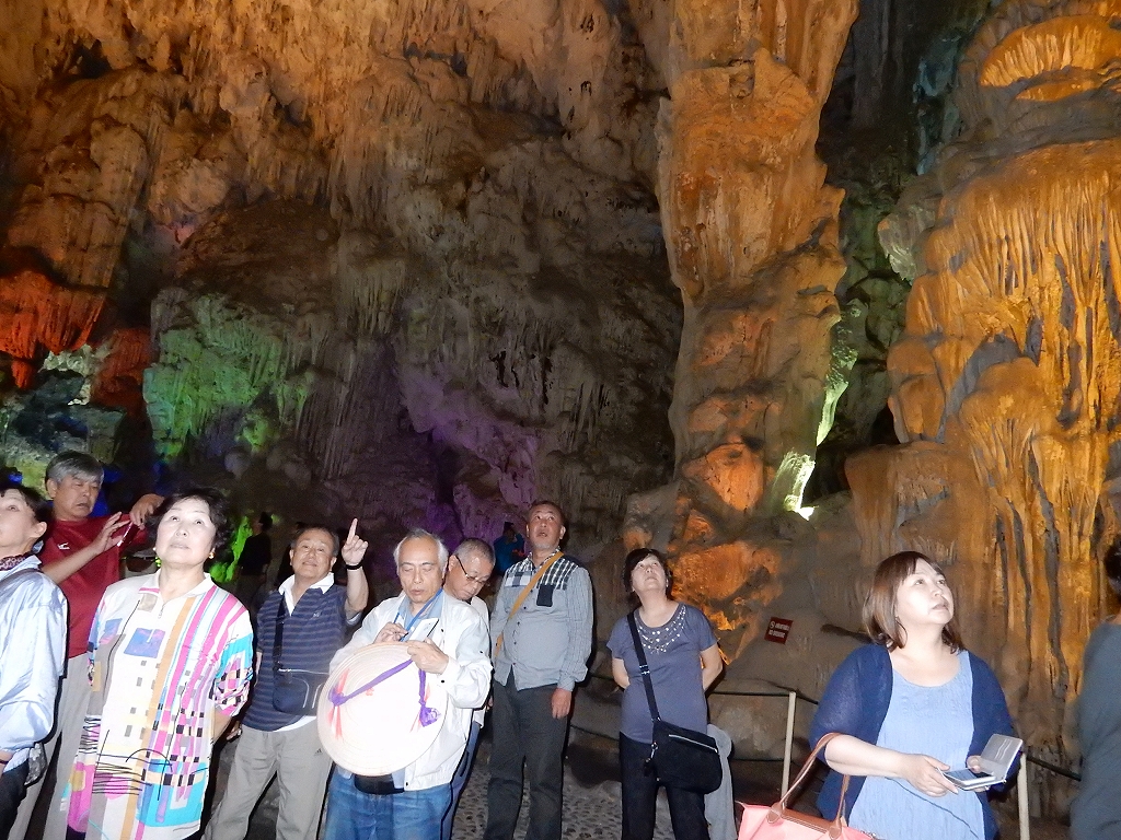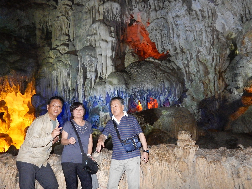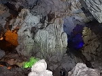 | 「世界遺産ティエンクン鍾乳洞」 ティエンクン洞は、ダウゴー島にある鍾乳洞で、天宮の意味がある。 ハロン湾に点在する鍾乳洞の中で、クルーズで立ち寄る最もポピュラーな鍾乳洞。 鍾乳洞の内部は高さ20m、幅10mほどでさほど広くはないが青や緑などにライトアップされいて幻想的な世界。 階段やフットライトで整備され内部は歩きやすくなっているが湿度が高く蒸し暑い。 ユニークな名前がついた鍾乳石や石筍がある。 |