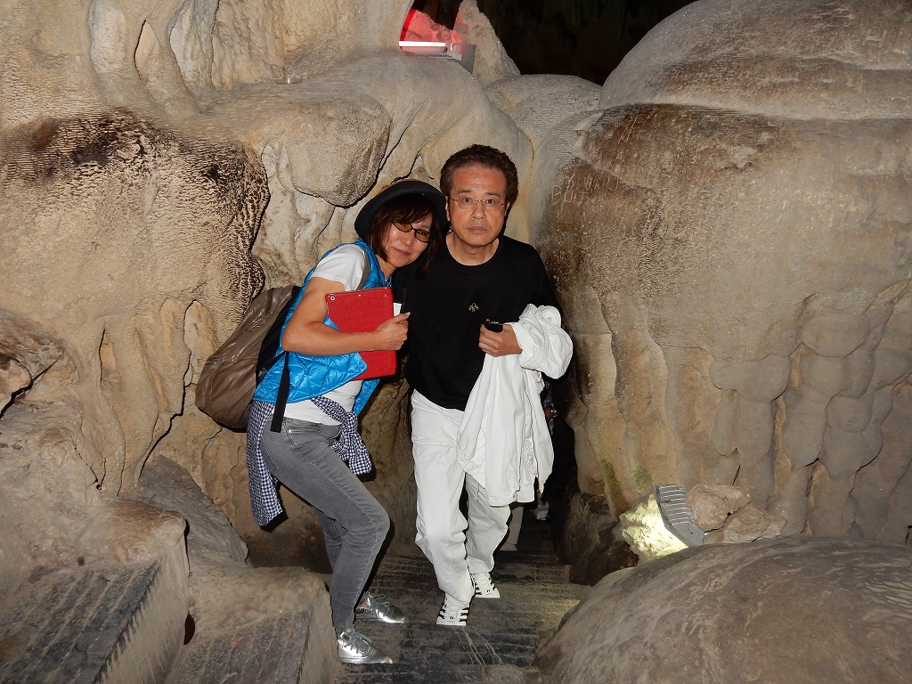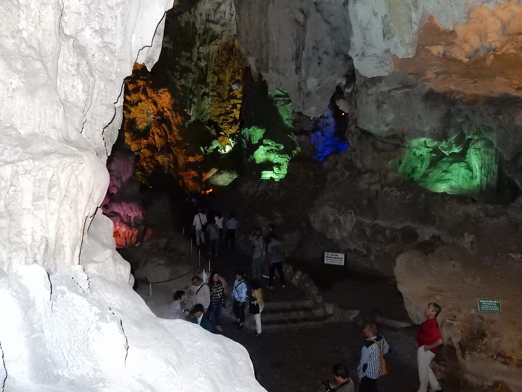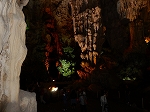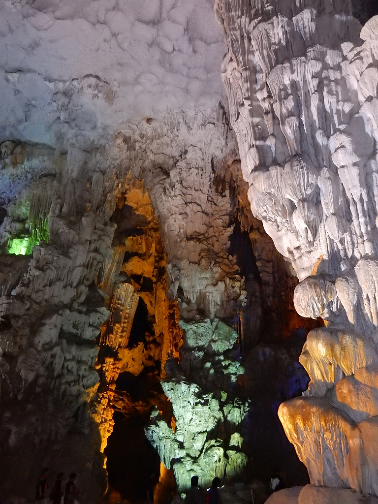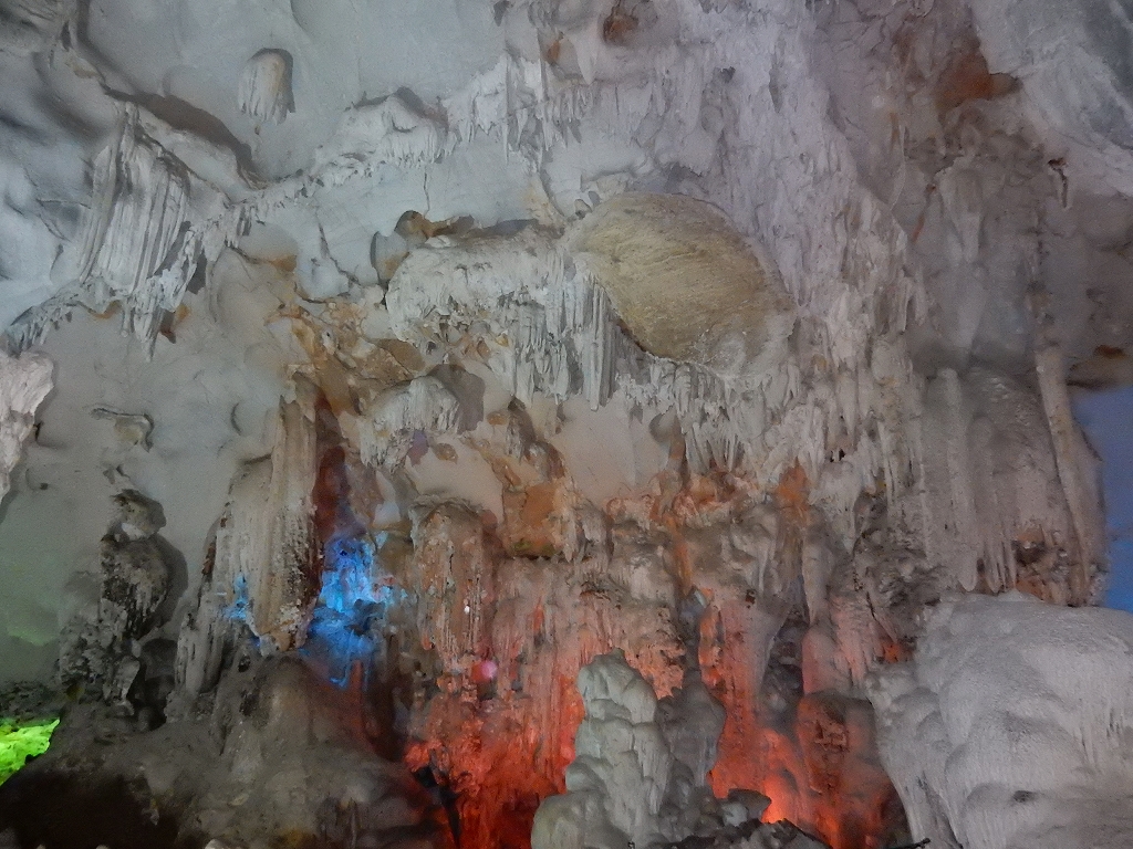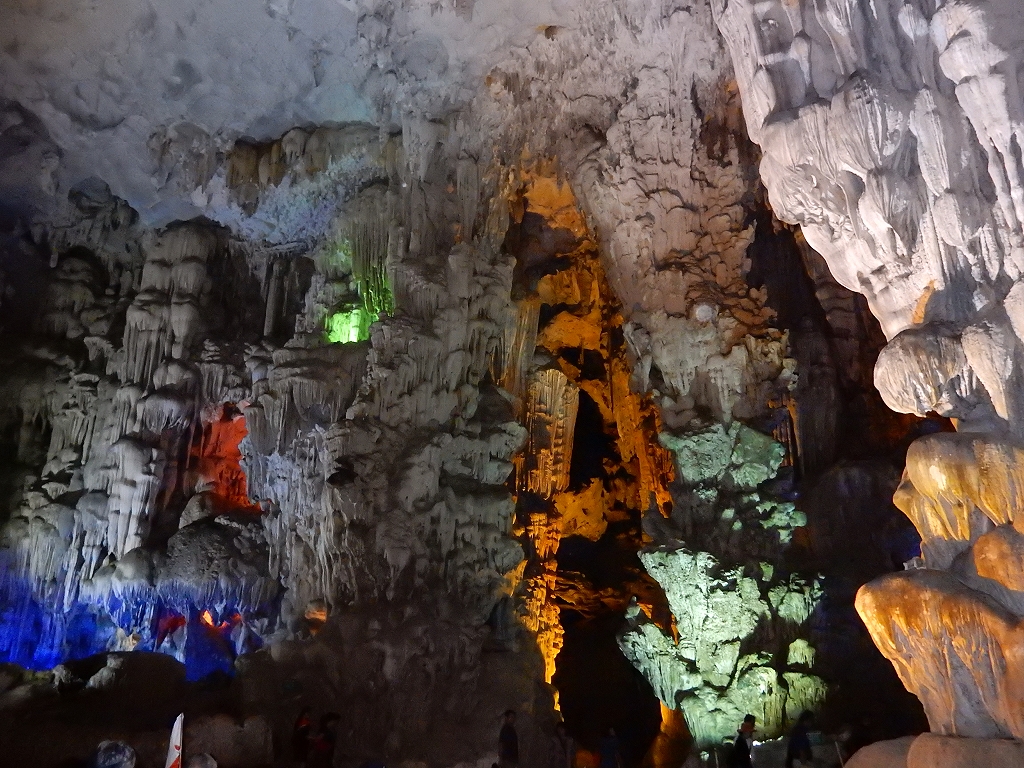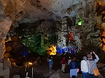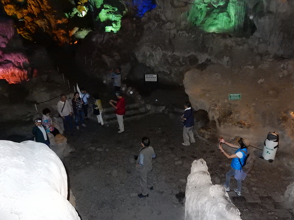 | 「世界遺産ティエンクン鍾乳洞」 ティエンクン洞は、ダウゴー島にある鍾乳洞で、天宮の意味がある。 ハロン湾に点在する鍾乳洞の中で、クルーズで立ち寄る最もポピュラーな鍾乳洞。 鍾乳洞の内部は高さ20m、幅10mほどでさほど広くはないが青や緑などにライトアップされいて幻想的な世界。 階段やフットライトで整備され内部は歩きやすくなっているが湿度が高く蒸し暑い。 ユニークな名前がついた鍾乳石や石筍がある。 |