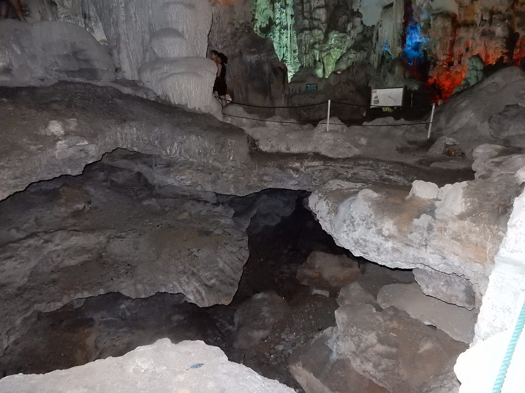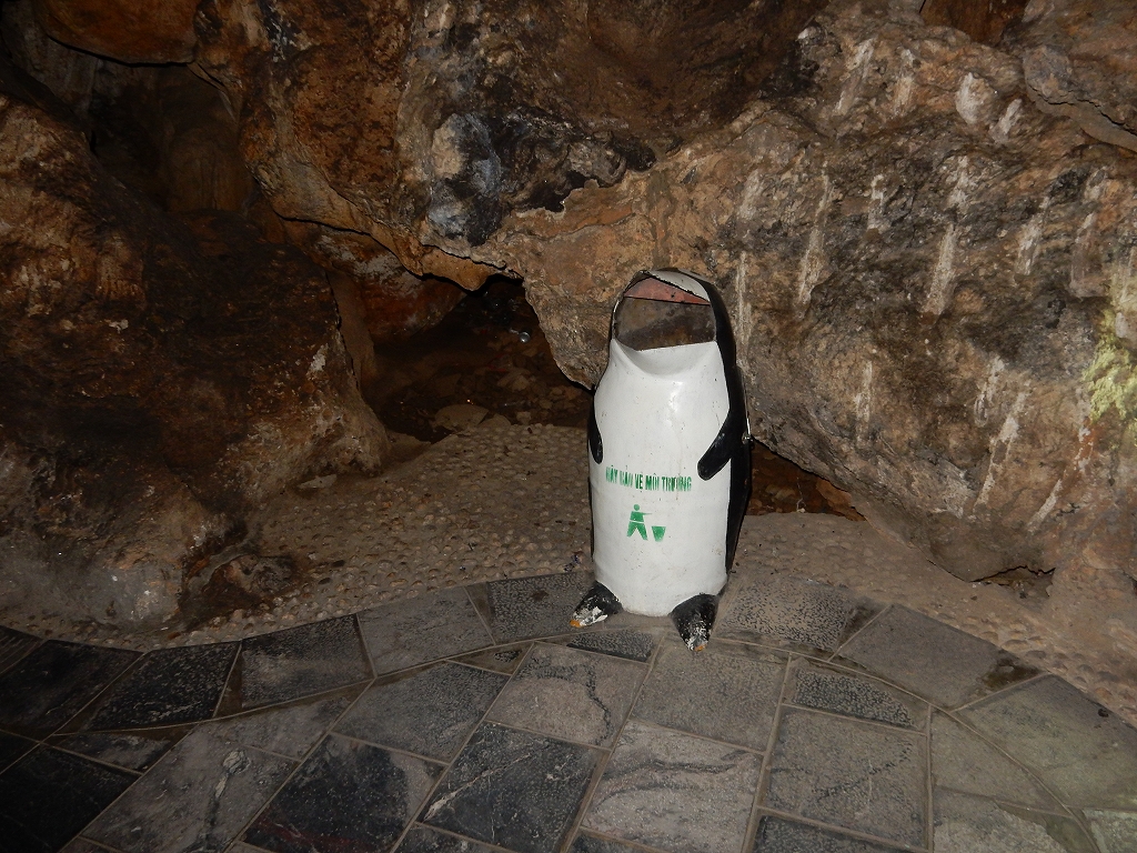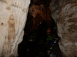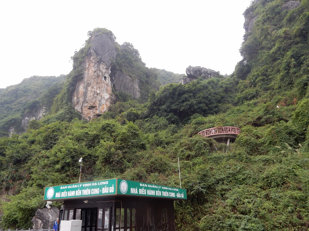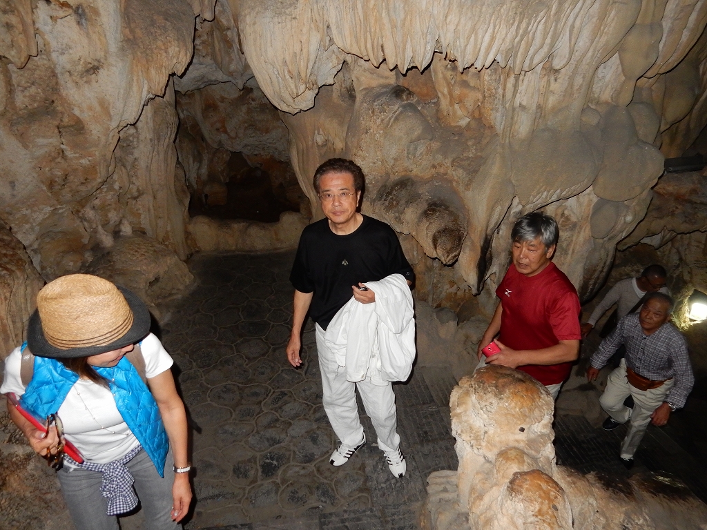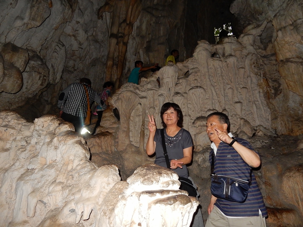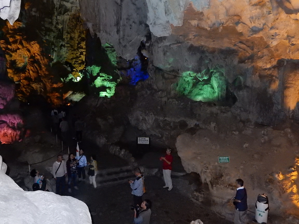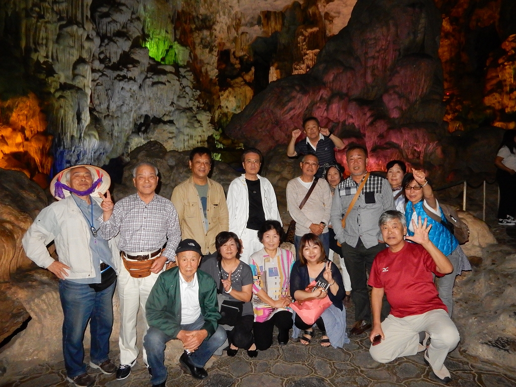 | 「世界遺産ティエンクン鍾乳洞」 ティエンクン洞は、ダウゴー島にある鍾乳洞で、天宮の意味がある。 ハロン湾に点在する鍾乳洞の中で、クルーズで立ち寄る最もポピュラーな鍾乳洞。 鍾乳洞の内部は高さ20m、幅10mほどでさほど広くはないが青や緑などにライトアップされいて幻想的な世界。 階段やフットライトで整備され内部は歩きやすくなっているが湿度が高く蒸し暑い。 ユニークな名前がついた鍾乳石や石筍がある。 |