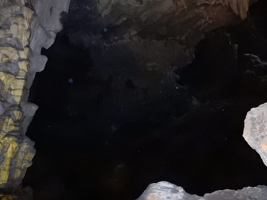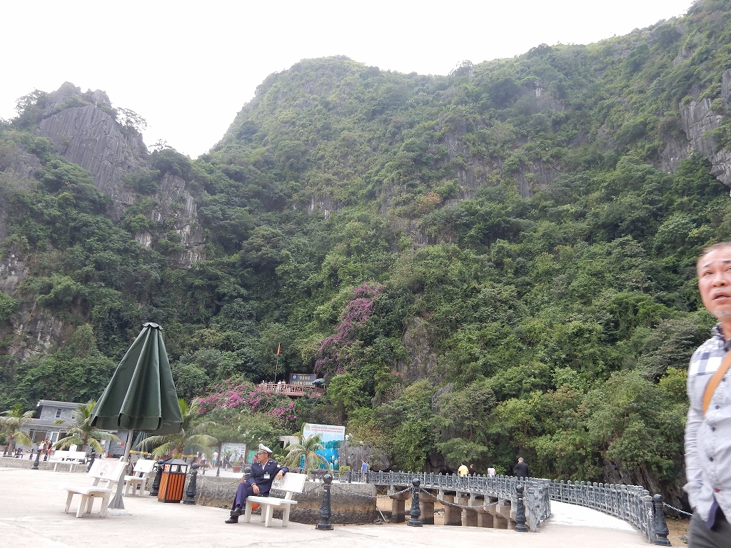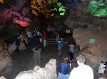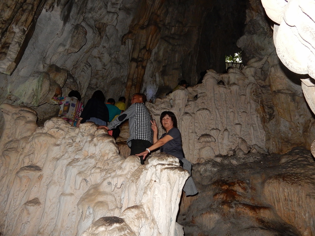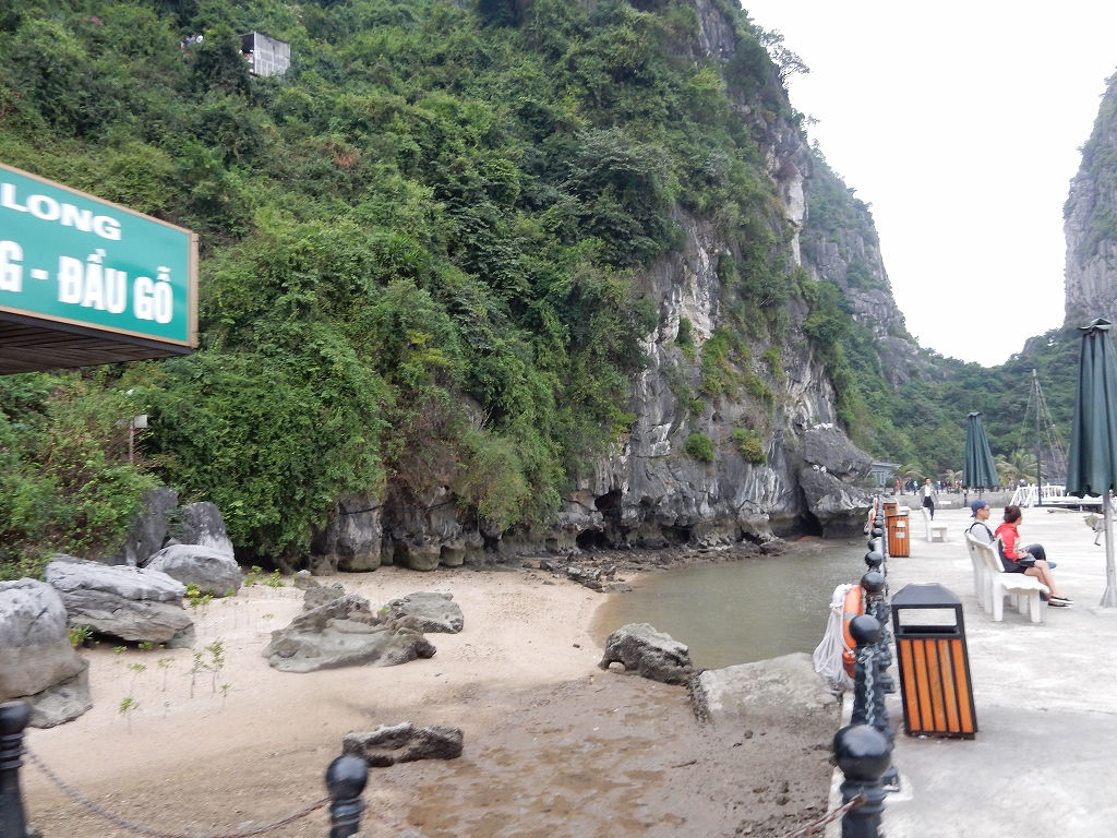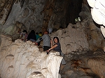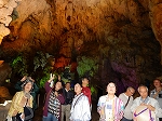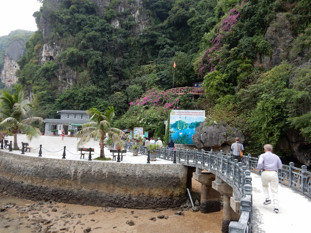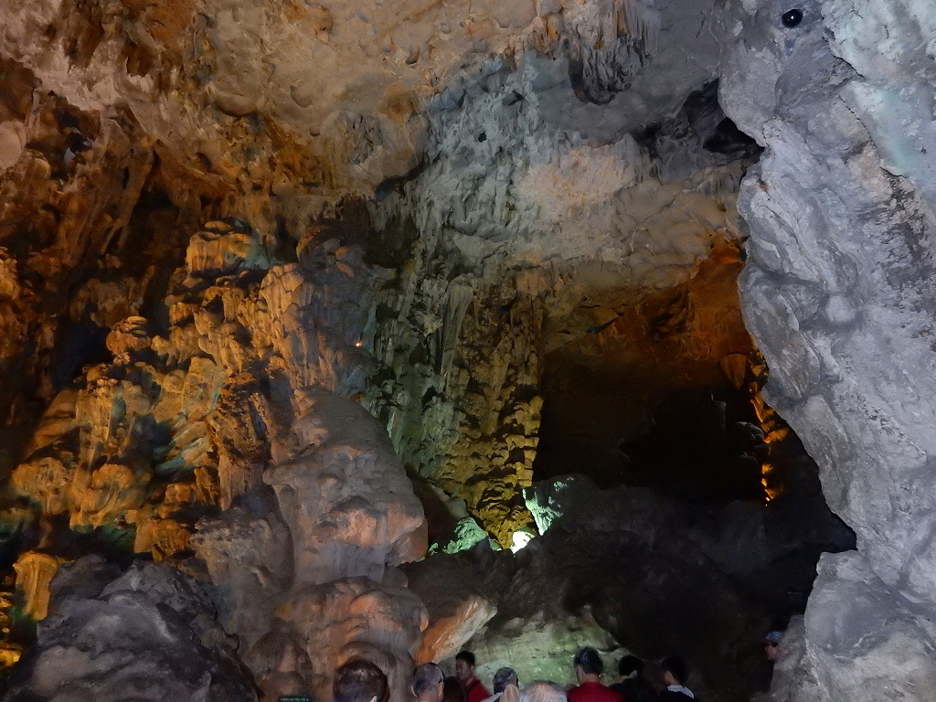 | 「世界遺産ティエンクン鍾乳洞」 ティエンクン洞は、ダウゴー島にある鍾乳洞で、天宮の意味がある。 ハロン湾に点在する鍾乳洞の中で、クルーズで立ち寄る最もポピュラーな鍾乳洞。 鍾乳洞の内部は高さ20m、幅10mほどでさほど広くはないが青や緑などにライトアップされいて幻想的な世界。 階段やフットライトで整備され内部は歩きやすくなっているが湿度が高く蒸し暑い。 ユニークな名前がついた鍾乳石や石筍がある。 |