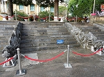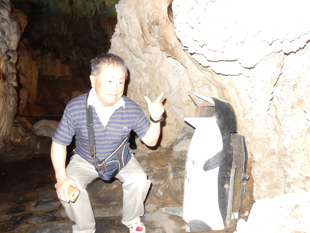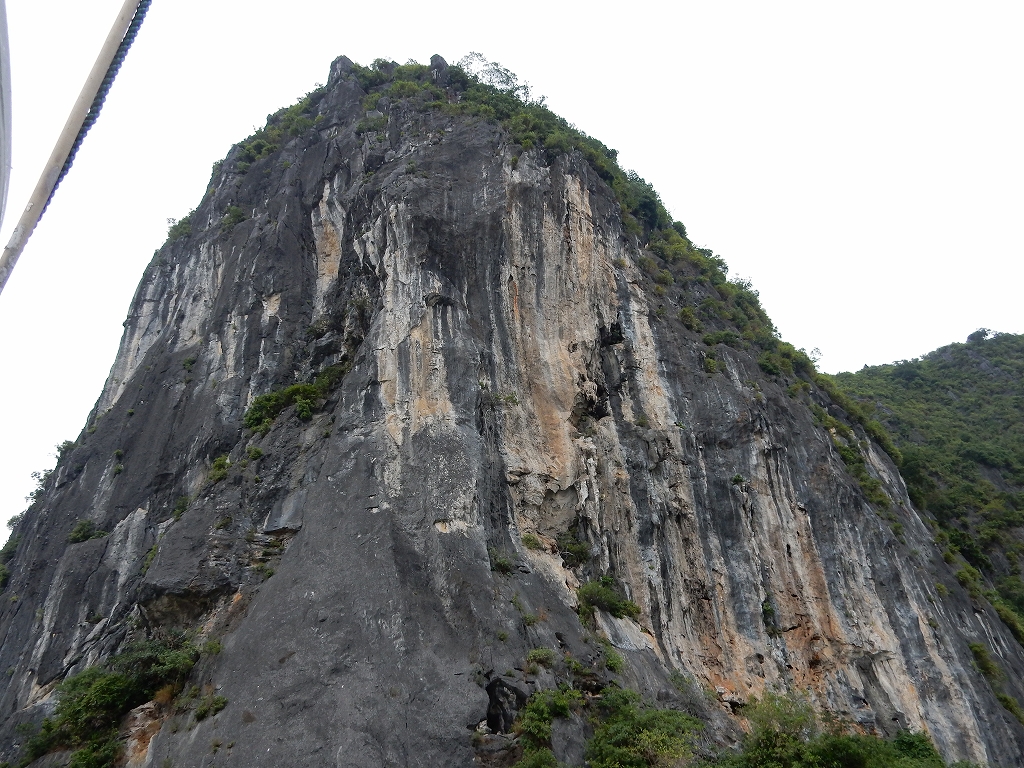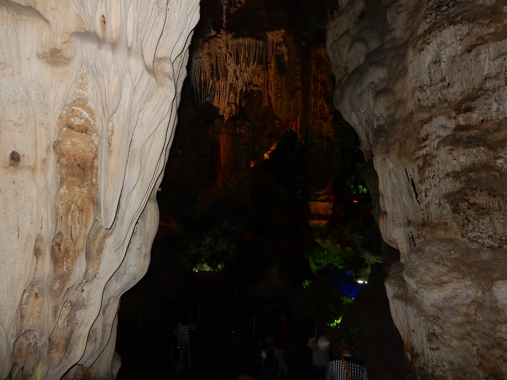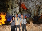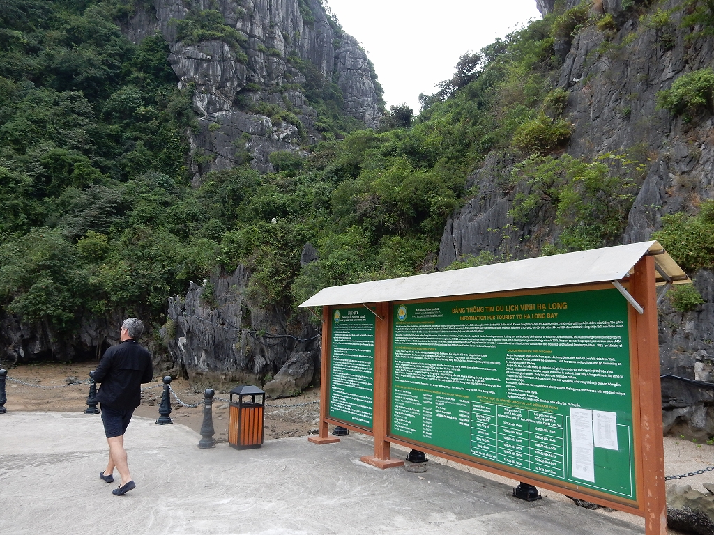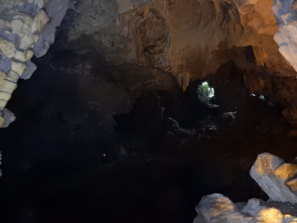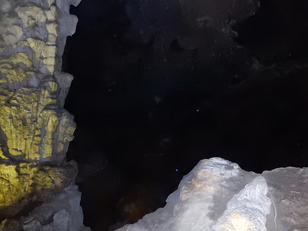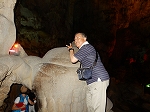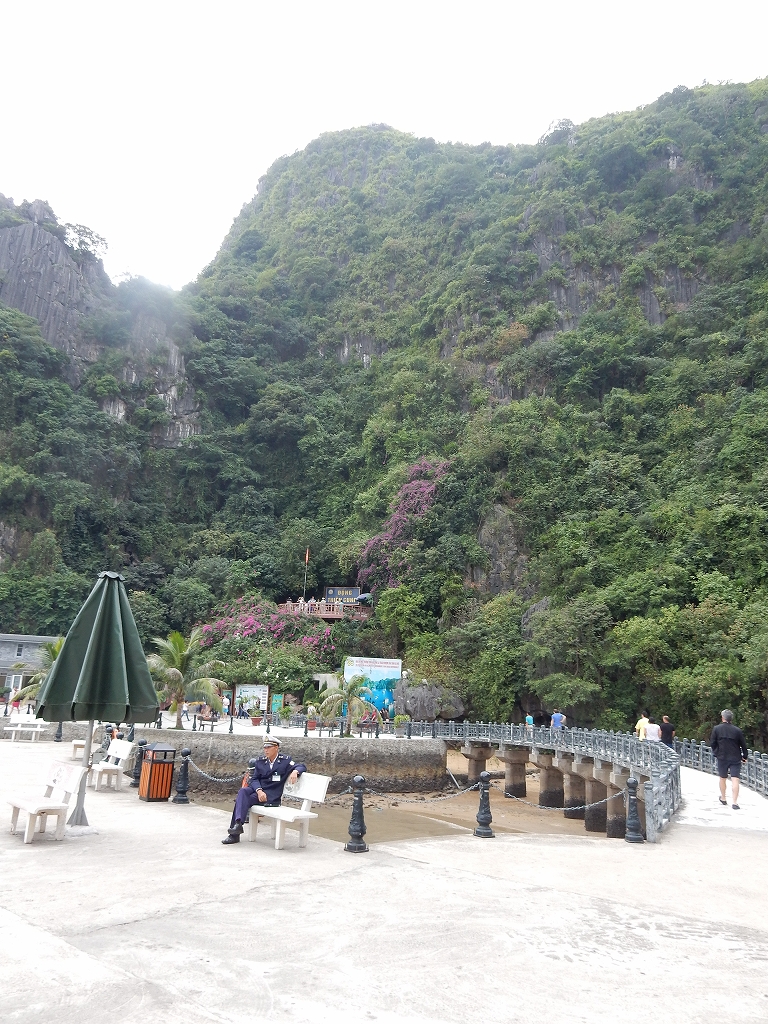 | 「世界遺産ティエンクン鍾乳洞」 ティエンクン洞は、ダウゴー島にある鍾乳洞で、天宮の意味がある。 ハロン湾に点在する鍾乳洞の中で、クルーズで立ち寄る最もポピュラーな鍾乳洞。 鍾乳洞の内部は高さ20m、幅10mほどでさほど広くはないが青や緑などにライトアップされいて幻想的な世界。 階段やフットライトで整備され内部は歩きやすくなっているが湿度が高く蒸し暑い。 ユニークな名前がついた鍾乳石や石筍がある。 |